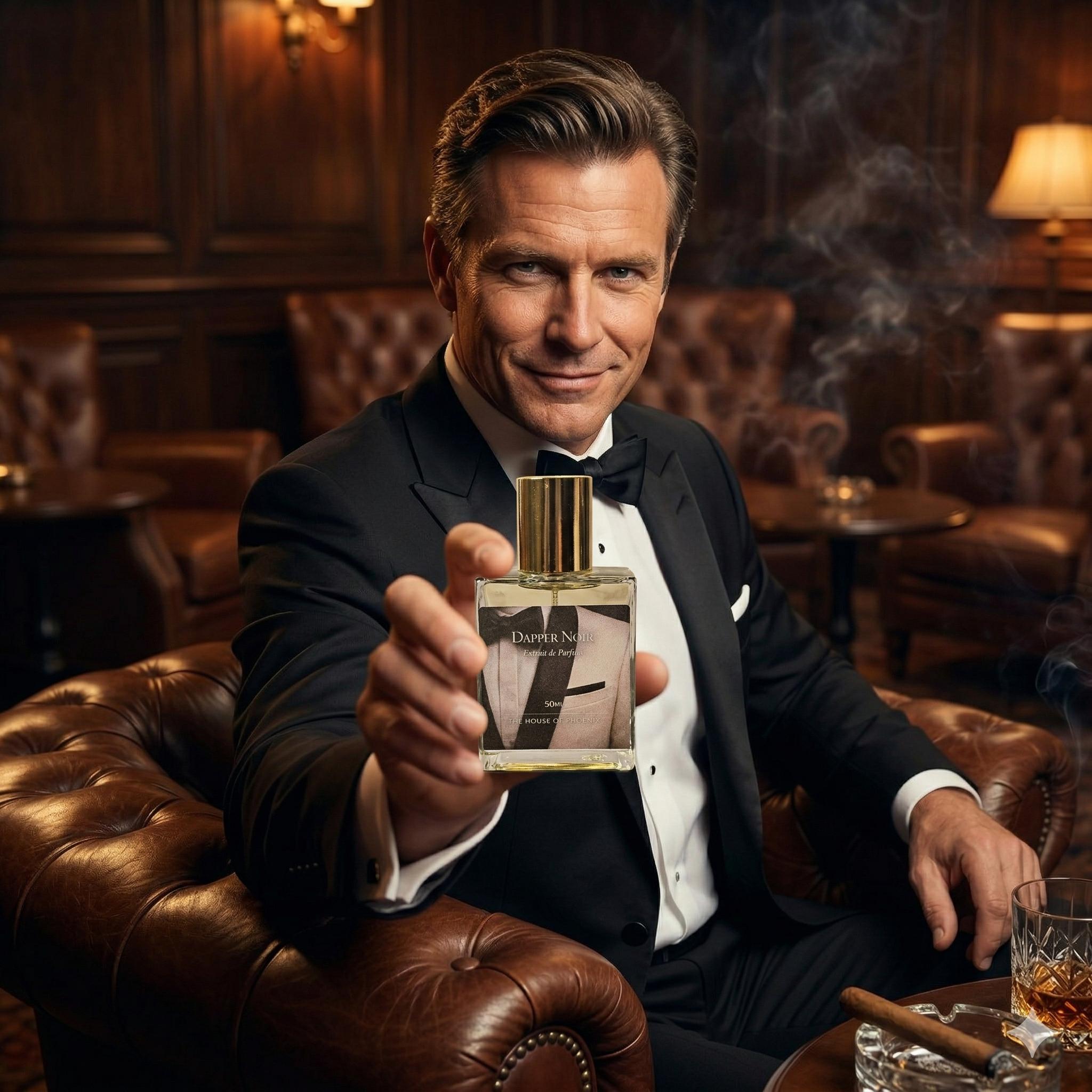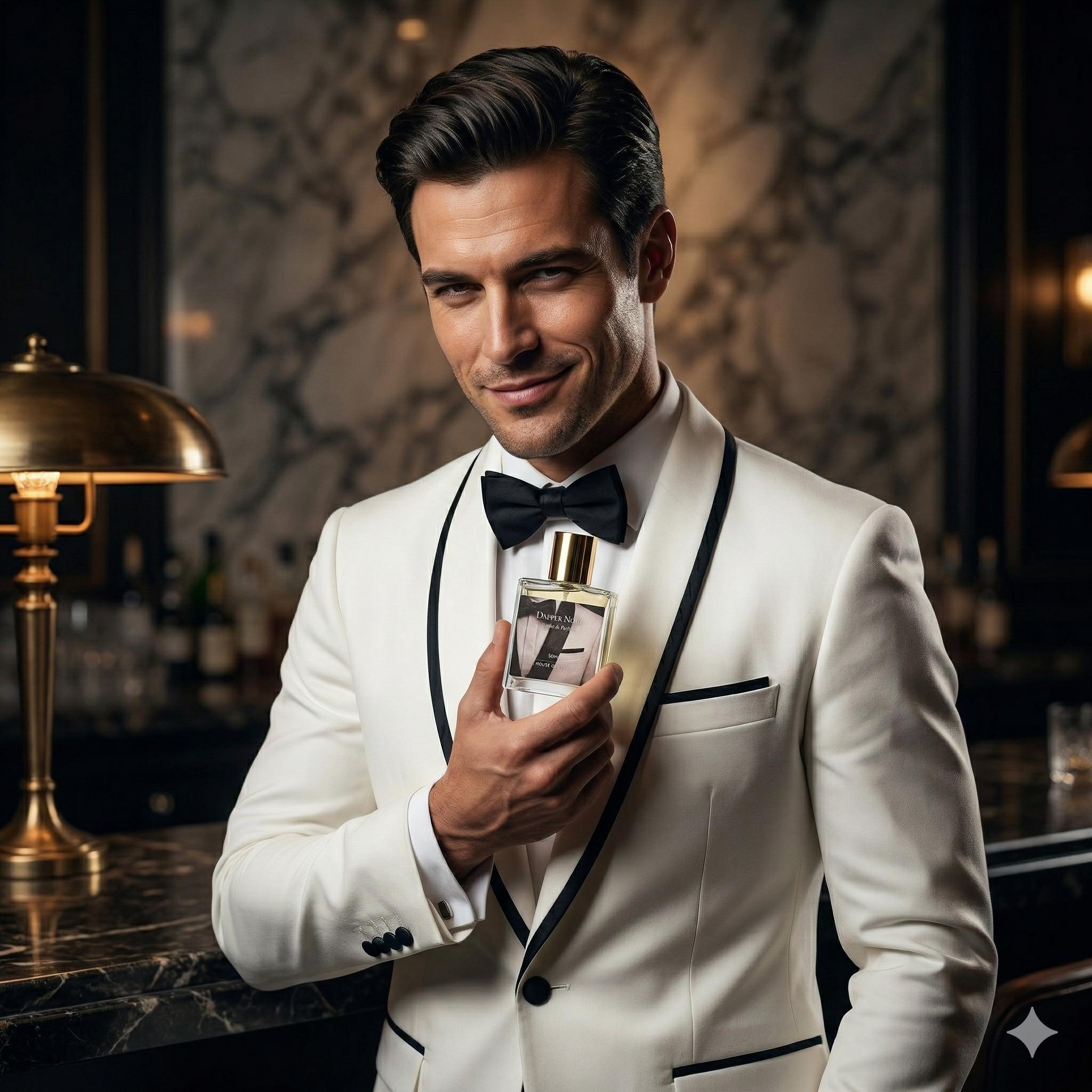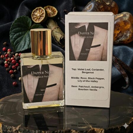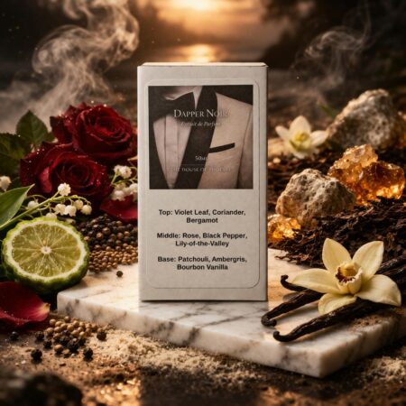 Dapper Noir is a refined extrait de parfum inspired by Tuxedo for timeless evening elegance. It opens with fresh violet leaf, coriander, and bergamot, giving way to a smooth heart of rose, black pepper, and lily-of-the-valley. As it settles, patchouli, ambergris, and bourbon vanilla create a polished, warm finish with depth and character.