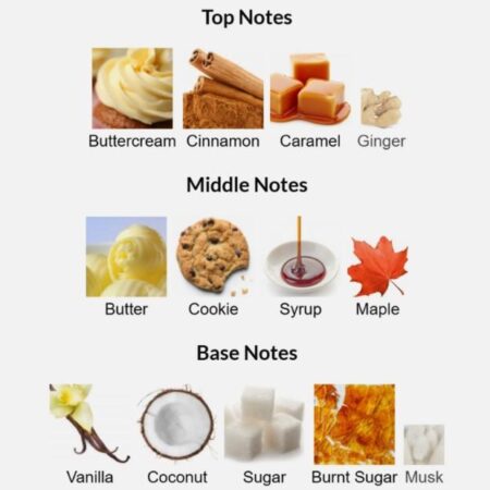 • Top Notes: Carmel, Buttercream, Ginger, Cinnamon • Middle Notes: Cookie, Butter, Maple Syrup • Base Notes: Caramelized Sugar, Vanilla, Coconut, Musk